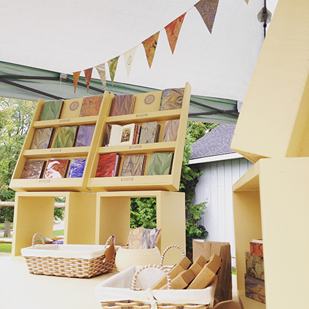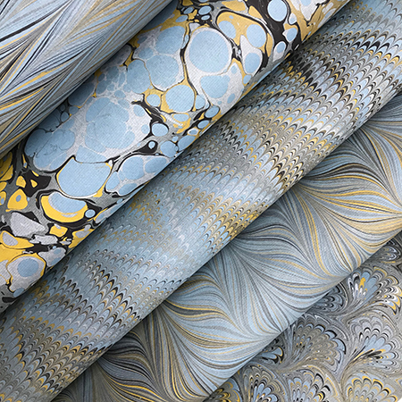 The marbled papers I create or the papers I source from other makers continually inspire me to use them to create unique stationery items and decorative objects.
